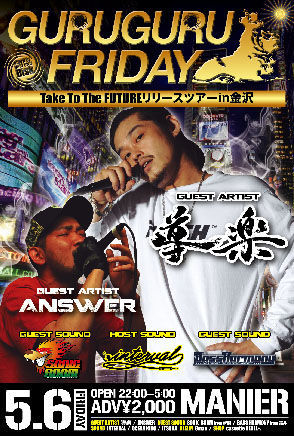 宣伝失礼します。 ◎GURUGURU FRIDAY◎ ■日時■ 2011年5月6日(金) OPEN 22:00 〜 ■料金■ ADV2,000円 DOOR2,500円 ■会場■ MANIER (石川県金沢市片町1-6-10 ブラザービル 4F(1Fサンクスさんが目印)) [GUEST ARTIST] 導楽 from湘南 ANSWER from湘南 [GUEST SOUND] SONIC BOOM from新潟 BASS HARMONY from福井 [SOUND] INTERVAL OCEAN KING ITSUKA [DEEJAY] 8-MAN [SHOP] cassette REBEL+ ○チケット取扱店 {金沢} MANIER / CHAMP / DOUBLE BURGER / TSUTAYA金沢店 {小松}