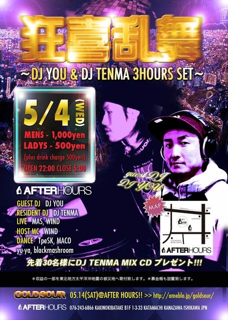 管理人様告知失礼します。 5/4@AFTERHOURS 「狂喜乱舞」〜DJ YOU & DJ TENMA 3Hours Set〜 OPEN 22:00 CLOSE 5:00 男:1000円 女:500円 別途ドリンク代が必要となります。 先着30名様にDJ TENMA MIXCDプレゼント! 【GUEST DJ】 YOU 【Resident DJ】 TENMA 【LIVE】 MAS WIND 【DANCE】 TpeSK MACO yu-ya blackmashroom 【HOST MC】 WIND 第一回が大盛況で幕を閉じた狂喜乱舞 !!! 今回はゴールデンウィークに開催 !!! ゲストにDJ YOUを迎えて、DJ TENMAと2DJで各3