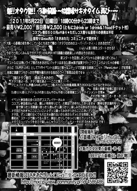 【5月14日】二次会詳細決定致しました ↓↓↓ リゾートダイニング SAKURA http://r.gnavi.co.jp/c946900/ 住所:〒542-0085 大阪府大阪市中央区心斎橋筋1-5-5 EAST BLD4F TEL:06-6241-9878 地下鉄御堂筋線心斎橋駅 6番出口 徒歩3分 ★時間★ 20時30分〜22時30分 ★内容★ 全7品のコース+飲み放題 ★料金★ 3,000円 ★定員★ 40名 ★募集締め切り★ 5月18日18時まで 【4月18日】タイムテーブル決定いたしました(^0^)/ 本文中に記載してますので皆さん確認お願いします(^3^) 二次会に関してはもう少