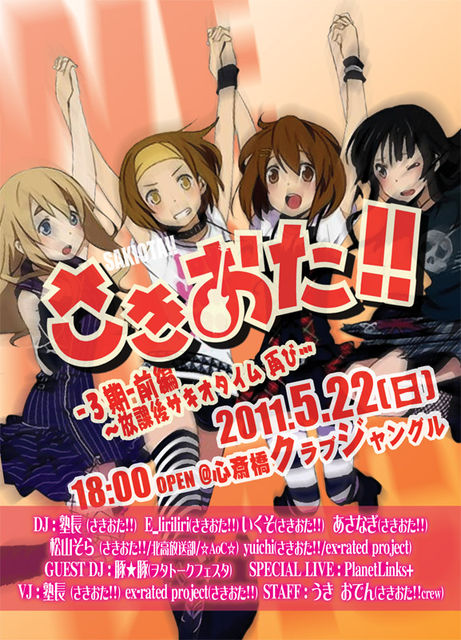 『第31回 江坂アニカラオフ』のお知らせです! 5月になれば花粉症もほぼなくなって過ごしやすくなると思います。 この時期には大型連休もありますが、GWの締めにアニカラのオフ会で歌いまくって楽しむというのはいかがでしょうか? ★日時 2011年5月8日(日) 11:00〜20:00(予定) ★決行最低人数 4名以上 ※締め切りまでに最低人数に到達しない場合は、イベント中止あるいは、別日程での仕切りなおしとなります。 参加表明いただいている方には個別にメッセージにて連絡させていただきます。 ★人数制限 基本的にあ