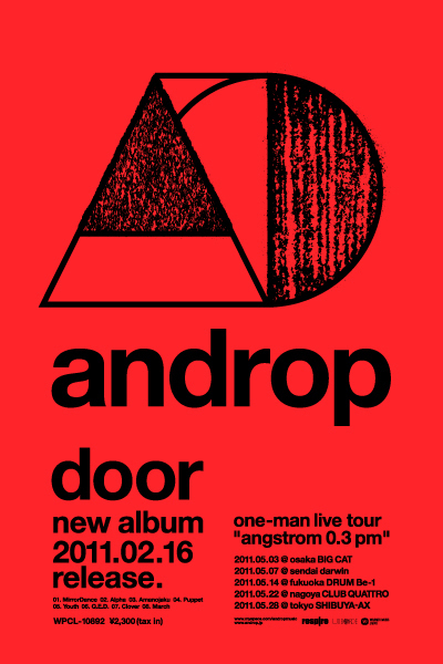 ワンマンライブツアー “angstrom 0.3 pm” 2011/5/3(tue)@大阪 BIGCAT 【sold out】 INFO / キョードーチケットセンター (06-7732-8888) 2011/5/7(sat)@仙台 darwin 【sold out】 INFO / キョードー東北 (022-217-7788) 2011/5/14(sat)@福岡 DRUM Be-1 【sold out】 INFO / キョードー西日本 (092-714-0159) 2011/5/22(sun)@名古屋 CLUB QUATTRO 【sold out】 INFO / サンデーフォークプロモーション (052-320-9100) 2011/5/28(sat)@東京 SHIBUYA-AX 【sold out】 INFO / サンライズプロモーション東京 (0570-00-3337)