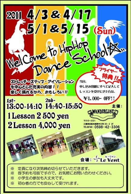 管理人様 失礼します。 ☆☆ 緊急連絡!!!! ☆☆ 緊急連絡です。 昨年からスタートしたダンスレッスンが、2月からパワーアップします!! 皆様のご好評の声にお応えして、 月イチレッスンが、月2回になりました!! 毎月第一、第三日曜日開催です。 レッスン時間も増えて今までよりしっかり踊れます。 月に一度で、なかなかタイミングが合わなかった皆様お待たせしました。 さぁ、Let' Dancing !! ☆☆★☆☆ 5月1日・15日 開催です!! ☆☆★☆☆ 今回もインストラクターさんは、Y