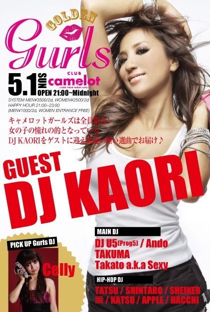 管理人様告知失礼します。 GWキャメロット史上最大のフェス開演 15,0000人が集まる豪華11DAYSの4日目はGOLDEN gurls キャメロットガールズは全員集合 MAIN FLOORは女の子のあこがれの的となっているDJ KAORIをゲスト に迎え間違いない選曲でお届け HIPHOP FLOORはCAMELOT毎週金、土曜日のレジデントDJでありスクラッチの日韓チ ャンピオンのDJ SHINTARO、VENOS、HARLEMなどHIPHOP箱を中心に活躍するDJ TATSU 、DJ SHEKERに加え都内で活躍するDJ陣が最新のHIT曲はもちろんの事、定番曲か