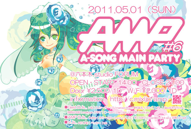 Anime(A-song) Main Party = AMP = 増幅器 皆で楽しんでHAPPYな気持ちを増幅しよう! "素敵なDJとヲタクで作る最高のアニソン(A-song)PARTY!!! "AMP" 前回のAMP SP!!!は大成功で終了いたしました!! 遊びに来てくれた皆様どうもありがとうございます!! そんな、感動の日から一週間。。。 AMP #6の開催です!! 今回はホームのFORUMにて開催☆ 今回もアニソン、ニコ曲、ボカロ、東方をガンガン流します♪ 縦横無尽に鳴り響くA-SONGを楽しんじゃおう! モチロン、出演・STAFF陣はコスプレ参戦♪ お客様