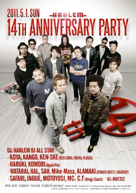 管理人様書き込み失礼します! 5/1(Sun)渋谷HARLEM 14th Anniversary!!! Open 22:00〜 DJ: HARLEM DJ ALL STAR KOYA, KANGO, KEN-SKE (RED ZONE/ ROYAL FLUSH) HARUKI, KOMORI (Apple Pie) WATARAI, HAL, SAH, Mike-Masa, ALAMAKI (PUNCH OUT!!!/ BEATRIP) SAFARI, INOUE, MOTOYOSI (Kings Court) MC: C.T VJ: MATTEE 5.1.SUN“HARLEM14THANNIVERSARYPARTY” !!!!! HARLEMが自信を持って世界へ発信する13DJs+1MC=14人の侍がこの日だけのSPECIAL SETと他の追随を許さない超豪華ターンテーブルリレーでHARLEMの14周年を伝説の