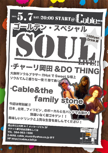 ゴールデンウィーク第六弾! 日本、台湾、フィリピンのボーカルと生バンドでお届け! 間違いなく超ゴキゲン!! 美味しいドリンクと上質な生音を楽しんでください! 【スペシャルゲスト】 東京にてギタープレイヤーとして様々なアーティストのレコーディング、ライブに参加しながら、自身で歌うソロ活動も展開中。 Ryo-hey http://www.myspace.com/ryohey0630 その才能、そのイケメン(笑)、とにかく早く皆さんに聴かせたいです!! Support Musician Keisuke(Dr) Dehara(Ba) 5月7日(土)スペシャル・ゴールデンSOULナイト!