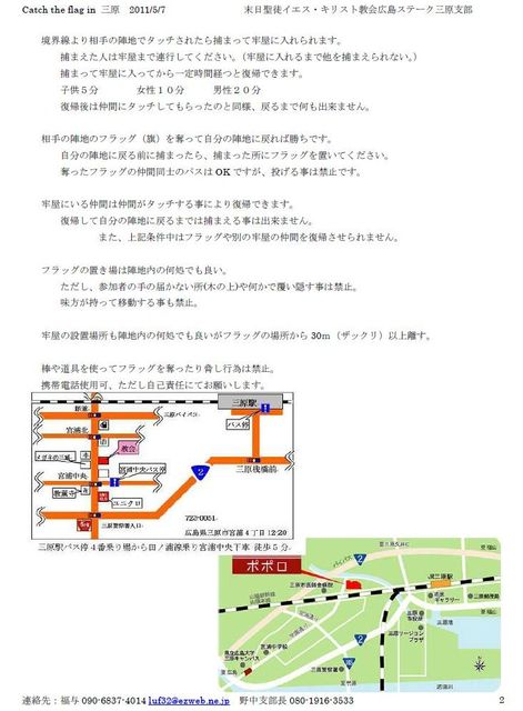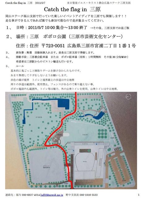 こんばんわ、三原の福與兄弟です。 5/7に三原で行いますスポーツ?イベントの案内です。 前にやってすごく楽しいイベントなので是非参加してください。 何か疑問質問ありましたら福與までメッセかコメントお願いします。 <<Catch the flag in 三原>> 岡山ステーク福山支部で行っていた楽しいイベントアイディアを三原でも開催します!! 走る事ができる人であれば誰でも参加可能なので是非集まってください。 1、 日時:2011/5/7 10:00集合〜13:00終了 →その後、三原支部でお昼ご飯 2、 場所:三原 ポポロ公園(三原市芸術