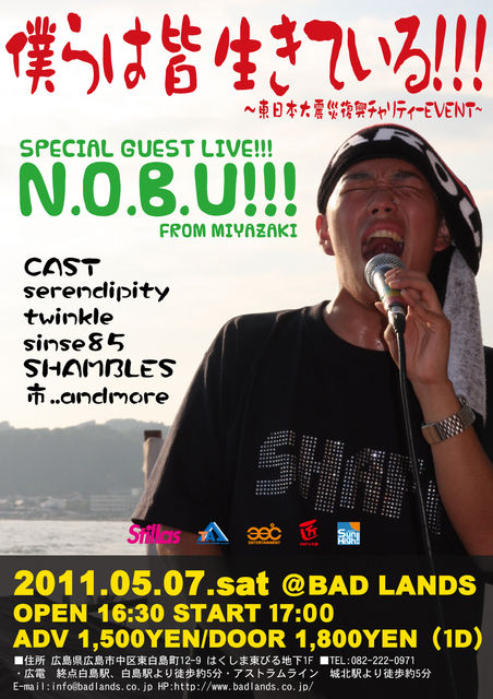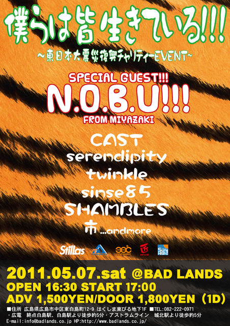 『僕らは皆生きている』 〜東日本大震災復興チャリティーEVENT!!!〜 <strong><font size="2">日時:5月7日(土) Open16:30 / Start17:00 会場:広島@BAD LANDS 料金(税込):前売¥1,500 / 当日¥1,800 (ドリンク代別途必要) ※チケット購入は、当日キャッシャー(受け付け)で 『N.O.B.U!!!で前売りお願いします!』と言って、 前売りチケットの購入をお願い致します! 席種:オールスタンディング (整理番号:無) 出演: ■Special Guest:N.O.B.U!!! from.宮崎 ■Cast:serendipity/twinkle/sinse85/SHAMBLES/市 etc...