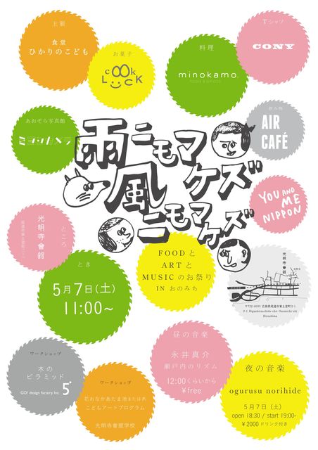 YOU&ME NIPPON PROJECT 雨ニモマケズ風ニモマケズ 2011,5,7sat @光明寺会舘 11時から 広島県尾道市東土堂町2−1 主催:食堂 ひかりのこども お問い合わせ:hikarinokodomo1@gmail.com tel: 090-5379-4298(町出) この度の食堂 ひかりのこどもは『雨ニモマケズ、風ニモマケズ』と題して 東京 京都 福岡 ロンドン 尾道 様々な土地でそれぞれに暮らしている 『ひかりのこどもの仲間たち』が尾道の光明寺会館に集合します! 東北関東大震災の被災地に一日でも早く、元気が戻るようにと みんな気持ちをひと