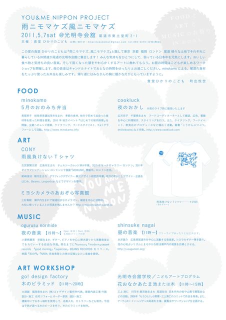 YOU&ME NIPPON PROJECT 雨ニモマケズ風ニモマケズ 2011,5,7sat @光明寺会舘 広島県尾道市東土堂町2−1 主催:食堂 ひかりのこども お問い合わせ:hikarinokodomo1@gmail.com tel: 090-5379-4298(町出) この度の食堂 ひかりのこどもは『雨ニモマケズ、風ニモマケズ』と題して 東京 京都 福岡 ロンドン 尾道 様々な土地でそれぞれに暮らしている 『ひかりのこどもの仲間たち』が尾道の光明寺会館に集合します! 東北関東大震災の被災地に一日でも早く、元気が戻るようにと みんな気持ちをひとつにして、Y