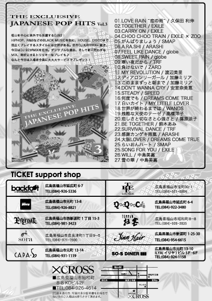 ■2011.5.7 (sat) << J-POP NIGHT ~日本の夜明けぜよ!~ >> @ CROSS ■START 22:00 ~ ■前売り 2000円 当日 2500円 / 共に1D ORDER ■入場者全員にDJ92 『EXCLUESIVE J-POP HIT #3』をプレゼント!!! ■DJ:KAYPAN , 92 ,TEXAS ,PISTON KITAMURA , SHU , NIHO , MONKATSU ,お宝BOYZ ■TICKET SUPPORT SHOP backfoot : 福山市延広町 6-7 TEL : (084)-926-5336 ETERNAL : 福山市西新涯町1丁目 15-3 TEL : (084)-981-3423 TEPPAN お宝 : 福山市昭和町8-8 TEL : (084)-928-2835 TREE LOUNGE : 福山市宝町30-1 TEL : (084)-9