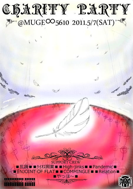 2011.5/7(SAT) @MUGEN5610 (CHARITY PARTY) ENTRANCE \2000(W/1D) OPEN22:00 CLOSE7:00 DJs 韋駄天(達磨さん) 慎(達磨さん) Double impact(COMMINGLE) ごはんです(Relation) 玲(乱踊/PSYDANCE) chaos.org(ケイオス興業 ENJOINT OF FLAT) NAOKI(High-jinks) 196(Pandemic) 琴(ENJOINT OF FLAT ケイオス興業) YU-KI(High-jinks) 煙虫(Pandemic) TakasizM(やぃっほ〜) DESIGNER 祭気動 SUPPORT CREW 乱踊/ケイオス興業/High-jinks/Pandemic/ENJOINT OF FLAT/COMMINGLE/Relation/やぃっほ〜 この度の東北関東