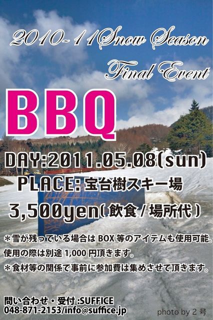 どもMAEです SUFFICE恒例のシーズンお疲れ様飲み会 今年は趣向を変えてゲレンデでの BBQとして開催します もちろんゲレンデでの開催なんで、 雪が残っていたら滑走もOK (参加費の他に1,000円掛かります。) もちろん雪のない所でSKATEもOK もちろん誰でも参加OK もちろん仕込みもOK SUFFICEなんで楽しく最後を締めましょう シーズンお疲れ様BBQ 日程2011.05.08(SUN)10:00- 場所:宝台樹スキー場(群馬県) 参加費:3500円(食材等の準備の関係で店頭にて先に集めます。)