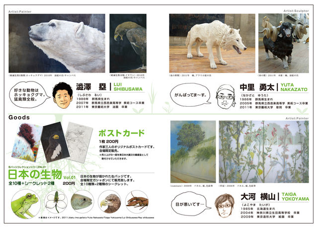ヒノデカニ商店とアーティストの共同企画による、彫刻と絵画の小さな作品展「動物と植物.」を開催致します。 動物と植物をモチーフに制作活動を展開する3名の作家を招き、彫刻と絵画による作品を展示致します。 会場は、自宅の居間を期間限定で展示スペースにした『じたくいまぎゃらりー』を開設。 小さなスペースですが、美術館やギャラリーよりも更に身近に作品のパワーを感じていただけると思います。 展示期間限定の、ポストカードや缶バッヂの販売もしています。 是非、遊びにいらっしゃって下さいね。 ・開催期間=2011年4月