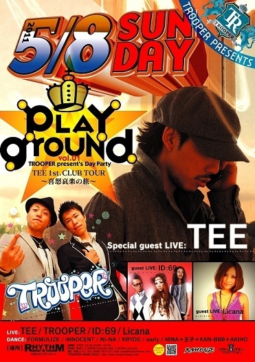 TROOPER present's PLAY GROUND Vo.1 TEE 1st CLUB TOUR〜喜怒哀楽の旅〜 【日時】2011年5月8日 (日) 【場所】CLUB RHYTHM/三重県伊勢市佐八町1154-4 【出演】 LIVE:TEE /TROOPER/ID:69 DANCE:/INNOCENT/NI-NA/KRYS early/NINA+王子+KAN-BBB+AKIHO/FORMULIZE 【時間】OPEN 18:00 START 18:30 【料金】前売り 2,500円(1drink付) 当日 3,000円(1drink付) 【問】伊勢リズム TEL 0596-39-0107 mail: boss@rhythmtimes.com http://rhythmtimes.com