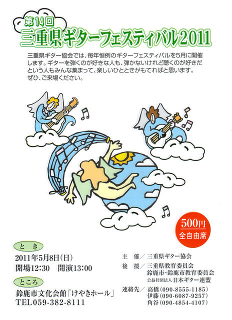 三重県ギター協会では、毎年ギターフェスティバルを5月に開催しています。ギターを弾くのが好きな人も、弾かないけれど聴くのが好きだという人もみんな集まって、楽しいひと時がもてればと思います。ぜひお誘い合わせの上、お越し下さい。 ・とき:2011年5月8日(日)午後1時開演 ・ところ:鈴鹿市文化会館けやきホール ・入場料:500円 ・主催:三重県ギター協会