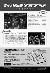 フィッシュマンズのコピーバンド、その名も いかれたBabys!!!!!!!!!! (いかれた Babys are... http://mixi.jp/view_diary.pl?id=1717656179&owner_id=2049720) 野音の興奮冷めやらぬまま、みんなで熱くなりましょう! 初ライヴが解散ライヴ! 次はないのでちょっとでも気になった方は是非気軽にお越し下さい! 静岡を中心に活動しているDjやバンドマンが、一年間セッションを重ねてなかなかの仕上がりになっています。 20時〜23時と短い時間ではありますが、併せてアナログ音源のフィッシュマンズ サウンドも楽しんで頂けます。 フィ