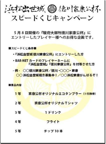 浜松市制100周年イベントとなっております。 浜松徳川家康公杯は、東北地方太平洋沖地震の チャリティーイベントとして開催し、以下3つの取り組みを 事前活動とし、家康公杯へと継承します。 ?浜松家康公杯事前イベントのハウストーナメント収益金の一部を拠出します ?TKSEED系列店舗に募金箱を設置します ?皆様のダーツプレイ代金の一部を拠出します Dragoonでは5/8(日)開催予定の浜松徳川家康公杯を全力でサポート するべく以下のイベントを開催し大々的に盛り上