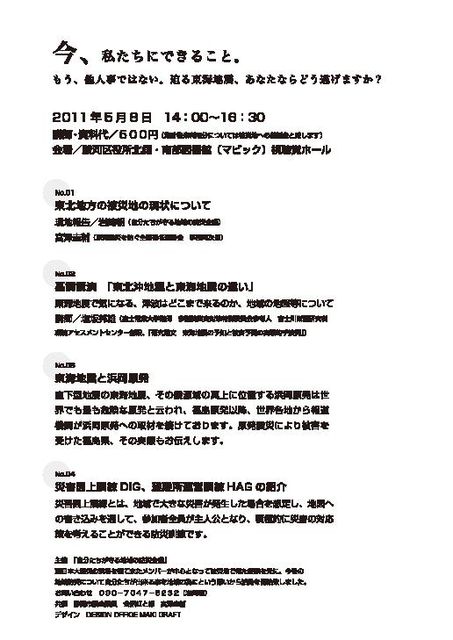 3月11日の東北大震災はけっして他人事ではありません。 来るべき東海地震に備えていま私たちにできることは? 緊急集会が開催されます。 5月8日(日) 14:00〜16:30 静岡市南部図書館(マビック)視聴覚ホール(駿河区役所北側) 資料代 \500.- チラシを貼り付けましたがこれでは読めませんよね。 こちらで拡大してご覧ください。 http://www.inple.co.jp/tsuushin/Go%20to%20bed%20HAMAOKA%201.html
