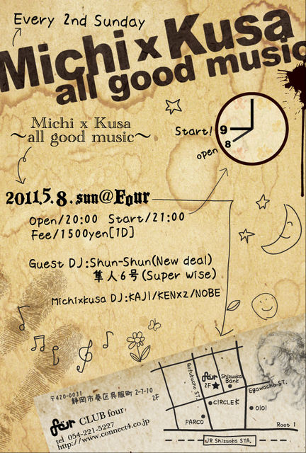管理人様、告知失礼します。 『Michi x Kusa』 ~all good music~ DATE/5.8(SUN) OPEN/20:00 Fee/1500yen[1D] Guest DJ:Shun-Shun(New deal) 隼人6号(Super Wise) Michixkusa DJS:KAJI/KENXZ/NOBE 二度目の開催Michixkusa! 低音とBreak beatsのアニューズメントパーク!! 今回はSHUN-SHUN氏と隼人6号氏をお迎えして、20:00から、 SHUN-SHUN presents 『スケートビデオを見ながらみんなでだべろう』 をお送りします。もちろん、2人のDJも必見ですよ ! お待ちしております!失礼しました