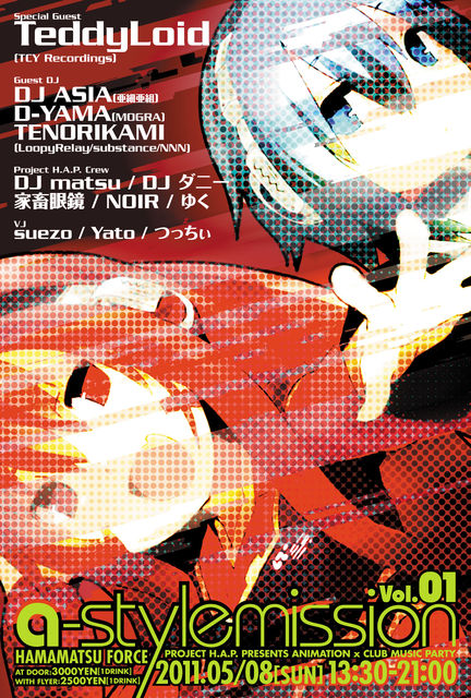 告知失礼致します! 浜松市でHAMAMATSU A-POP PARTY!をオーガナイズするProject.H.A.P.が、 Animation×Club Music をコンセプトにしたPARTYを新たに開催! HOUSE,TECHNO,ELECTRO,TRANCEといったクラブミュージックに、アニメーション要素を取り入れた ヲタク向けなクラブパーティです! 記念すべき1回目の開催に、なんとあのGAINAX制作のアニメ「Panty & Stocking with Garterbelt」において、主要な楽曲の制作を行ったTeddyLoidがスペシャルゲストで参戦! その他のゲストDJも、浜松でASIA系サウンドを中心に楽曲制作やDJをしており、