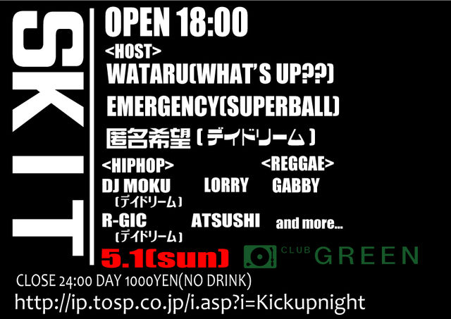 仕事でなかなかCLUBにいけない人 夜なかなかで歩けない人 HIPHOPやREGGAEが好きな人 音楽が好きな人 ぜひ体感しにきてください! 【skit】@CLUB GREEN 2011.0501(SUN) OPEN 18:00 CLOSE 24:00 DAY 1000yen(NO DRINK) =HOST= WATARU(WHAT'S UP??) EMERGENCY(SUPERBALL) 匿名希望(デイドリーム) =HIPHOP= DJ MOKU(デイドリーム) R-GIC(デイドリーム) ATSUSHI LORRY =REGGAE= GABBY and more...! この日はいつも以上に日本語ラップやジャパレゲが聴けます! 何かわからないことや質問があればメッセくだ