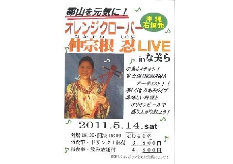 日時 5月14日19:00開演 会場 沖縄ダイニング な美ら 郡山市豊田町4−16 024−927−8417 料金 未決定 「LOVE! LIFE! LIVE!ふくしま」 日時 5月15日11:00〜16:00 会場 福島市まちなか広場(入場無料) 福島市内の有名飲食店が20数店舗出店、ステージでは「がんばろう!福島LIVE」と題して地元のミュージシャン、在京ミュージシャンが演奏! ※オレンジクローバーの出演は14:00〜14:40になります。