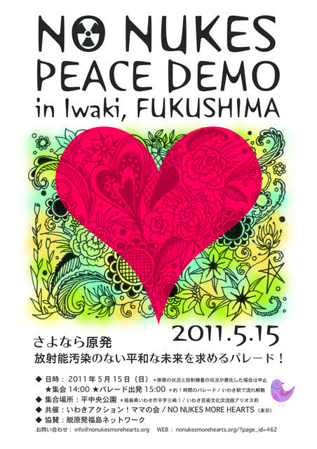 NO NUKES! PEACE DEMO in Iwaki, FUKUSHIMA さよなら原発・放射能汚染のない平和な未来を求めるパレード! ◆ 日時:2011年5月15日(日) *悪天候、原発の状況と放射線量の状況が悪化した場合は中止/ 当日HPにてお知らせします ★集会14:00 ★パレード出発15:00 *約1時間のパレード / いわき駅で流れ解散 ◆ 集合場所:平中央公園*福島県いわき市平字三崎1 / いわき芸術文化交流館アリオス前 ◆ 共催:いわきアクション!ママの会 / NO NUKES MORE HEARTS ◆ 協賛:脱原発福島ネットワーク どなたでもお