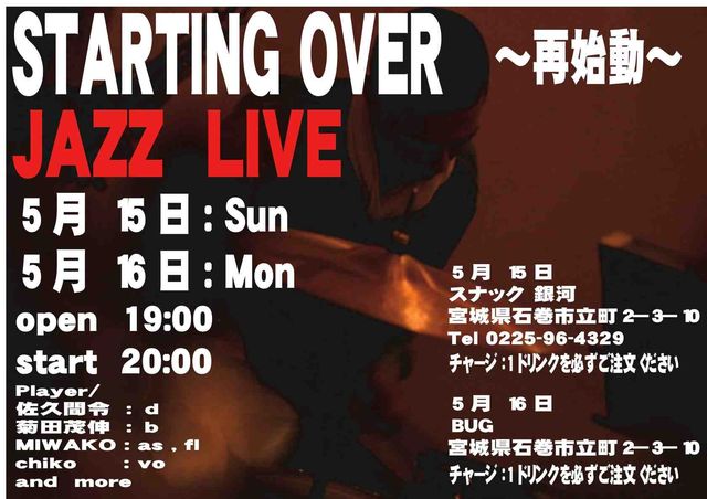 出演:佐久間令(d)、菊田茂伸(b)、miwako(as,fl)他 場所:スナック銀河(石巻) URL:http://9199.jp/phone_page/00465333/ 住所:宮城県石巻市立町2丁目3−10 Tel:0225-96-4329 時間、詳細はまた追って連絡します。 ご興味のお持ちの方はぜひメールください。sax_miwako@yahoo.co.jp 震災後一ヶ月でまだまだ瓦礫の散乱する街がいよいよ立ち上がるのです。 歴史的な日になると思います。マスメディアで取り上げたい、という方も大歓迎です。 皆さんの応援が必要なのです!!! 皆さんで石巻、盛り上げて行きましょう!!