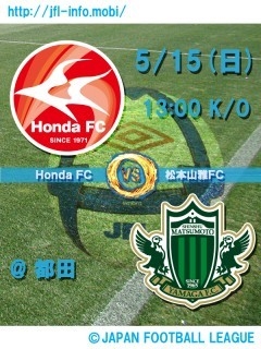 第13回 日本フットボールリーグ 前期 第11節 Honda FC vs. 松本山雅FC 2011年05月15日(日) 13:00 キックオフ 本田技研都田サッカー場(静岡県浜松市) http://www.honda-fc.gr.jp/stadium/index.htm [通算対戦成績] 2試合2勝0分0敗 10/06/27 JFL前17節 1○0 アルウィン 10/10/24 JFL後12節 3○0 都田 ◇松本山雅FC http://www.yamaga-fc.com/ <前期第10節の結果> vs. V・ファーレン長崎(H) 1△1 http://www.yamaga-fc.com/game2011/1304830816766.html [得点者]塩沢 勝吾(45分)有光 亮太(74分)
