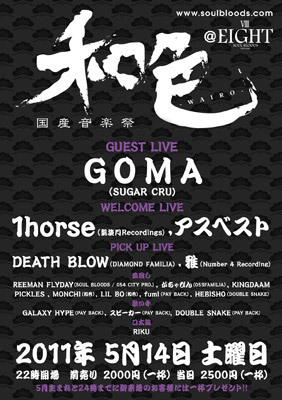 管理人様告知失礼します。 2011年 5月14日 土曜 和色 国産音楽祭 @EIGHT 22時開場 前売り 2000円(一杯) 当日 2500円(一杯) 5月生まれと24時までに御来場のお客様には一杯プレゼント!! GUEST LIVE GOMA (SUGAR CRU) WELCOME LIVE 1horse (凱旋門Recordings) アスベスト PICK UP LIVE DEATH BLOW (DIAMOND FAMILIA) 雅 (Number 4 Recording) 皿回し REEMAN FLYDAY (SOUL BLOODS/054 CITY PRO.) がちゃぴん (053 FAMILIA) KINGDAAM PICKLES MONCHI (和色