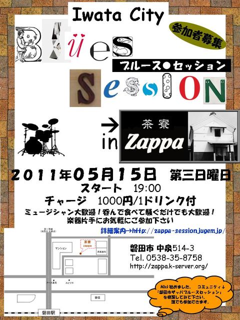 第5回ザッパブルースセッション 日時;2011年5月15日(日) 19:00〜 場所;茶寮Zappa 磐田市中泉514-3 Tel.0538-35-8758 チャージ;¥1,000/1ドリンク付 楽器弾けなくてもかまいません。呑んで騒ぐだけでも大歓迎です。 今回も盛り上がりますよー!! 皆さんお楽しみに! 情報公開ブログです↓ http://zappa-session.jugem.jp/
