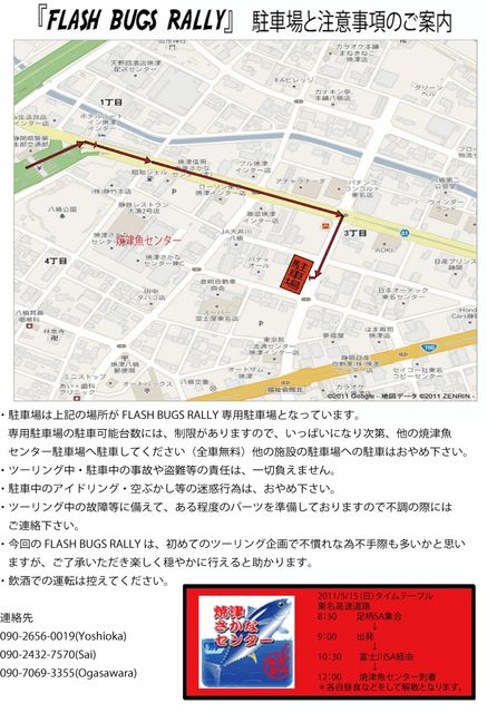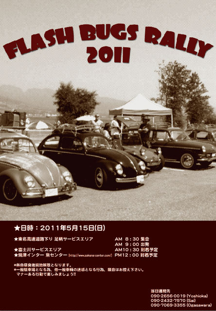 フラバグが中止になっちゃったので 『FLASH BUGS RALLY』になりました ただただ集まって皆で楽しく高速を走って美味しいマグロでも食べましょう。 っていうイベントです フラバグを楽しみにしてくれていた皆さんに是非参加していただきたいです 特に会費だとかエントリーだとかは、必要ありません。 何かご質問があれば私かフラワーオートにお問合せ下さい。 みんなで盛り上げてください よろしくお願いします 2011/5/15(日) 東名高速道路 8:30 足柄SA集合