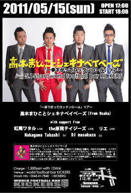 5月15日にworld football bar KICKERSで開催されるライブのご案内です。 * * * * * * * * * * * * * * * * * * * * * 高木まひことシェキナベイベーズ「一歩下がってロックンロール」ツアー 2011年5月15日(日) open17:00 start18:00 【LIVE】 高木まひことシェキナベイベーズ(from Osaka) 虹尾ワタル the原発テイジーズ リエ 【DJ】 Nakagawa Takashi DJ masakazu Charge:1,500円(with 1drink) Venue:world football bar KICKERS(富士市吉原2−11−8−2F:吉原商店街「串特急」の2F) お問い合わせ