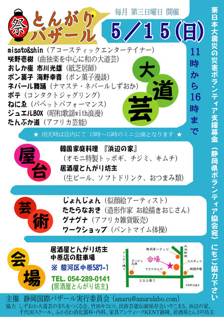 こんにちは。 とんがりバザールは 月に一度、大道芸と屋台とフリマのミニ縁日です。 中原近隣の方はぜひ、ゆっくり遊びに来てください。 ★パフォーマンスのタイムテーブル(予定)★ 第一部 11時〜 ねにゑ(パペット無言劇) 11時半〜 ジュエルBOX (昭和歌謡) 12時〜 おしか座 市川光雄 (紙芝居) 12時半〜 咲野壱樹 (曲独楽を中心に和の大道芸) 13時〜 ワークショップ「竹楽器で遊ぼう」 担当・たんぶか道 第二部 14時〜 ポテ (コンタクトジャグリング) 14時半〜 ナマステ・ネ