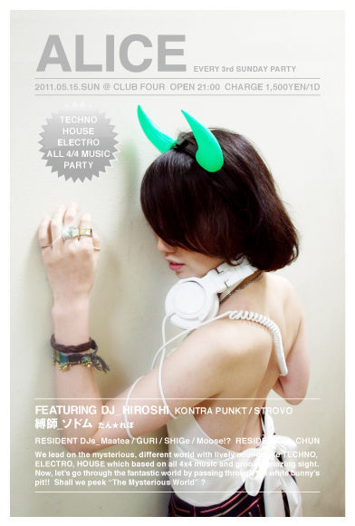 2011.05.15.SUN ALICE @CLUB FOUR http://www.connect4.co.jp/ FEATURING DJ HIROSI(KONYRA PUNKT/STROVO) 縛師 ソドム RESIDENT DJ GURI Maatea SHIGe Moose!? RESIDENT VJ CHUN OPEN : 21:00 CHAGE : 1,500YEN / 1D Genre:TECHNO/HOUSE/ELECTRO コミュニティ http://mixi.jp/view_community.pl?id=5501021 アリスブログ http://ameblo.jp/alice-mmsgc/ 旧暦5月にあたる皐月(さつき)のALICEはとっても異世界! 妖艶、かつ甘美な世界に皆様をお連れいたします! 今回、生