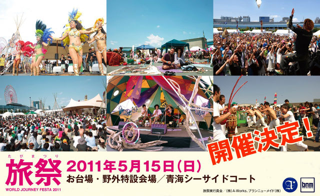 高橋歩プロデュース。年に一度の旅の野外フェス! 世界一周中の高橋歩ももちろん一時帰国し、トーク出演! 旅祭 WORLD JOURNEY FESTA 2011 【会場】 お台場・青海シーサイドコート(ヴィーナスフォート前) 【日時】 2011年5月15日(日)OPEN 10:00 / END 20:00 ◎出演アーティスト →高橋歩(作家・自由人) →MINMI →若旦那 →USA(EXILE) →SOFFet →GAKU-MC →Rickie-G →FUNKIST →ロバート・ハリス(作家・ラジオDJ) →たかのてるこ(旅人) →てんつくマン(映画監督・路上詩人) →小橋賢児(俳優・