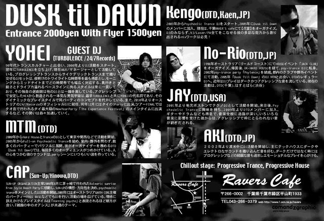 90年代トランスカルチャーと出会い、2000年よりDJ活動をスタート。翌年にTURBULENCEを立ち上げ、現在 A&R / マネージャーとして活動している。プログレッシブトランスからサイケデリックトランスまで織り交ぜるDJセットは、夜明け