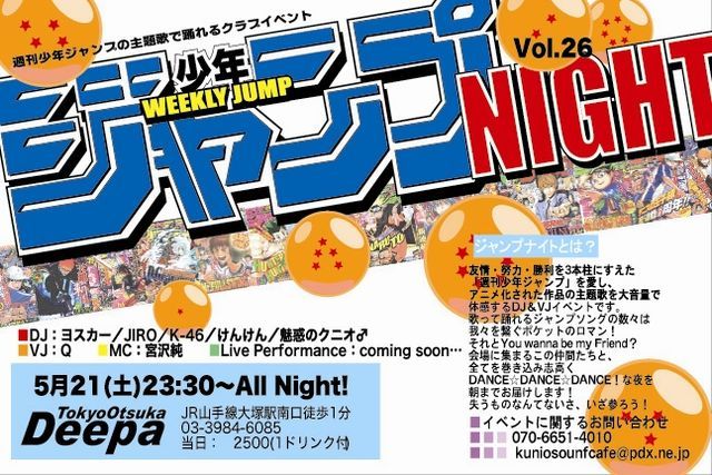 さてさて本題のご説明へ。 “ジャンプナイト”は一晩ジャンプ楽曲づくしのお祭りです。 内容、興奮度共に、 最高テンションを続け五月も探し物探しに行くのさ! いつもの皆さん、そしてもちろんはじめてご参加の方も大歓迎ですよ。 この春もお誘い合わせの上、ご予定頂けます様よろしくお願いしますね! ☆ご参加の方はこちらも是非一度読んでみて下さいね! http://mixi.jp/view_bbs.pl?id=52923068 特集のリクエストも受け付けております! “ジャンプナイトVol.26” 日時:5/21(土)23:30〜All Night! ※終了後も朝から二次