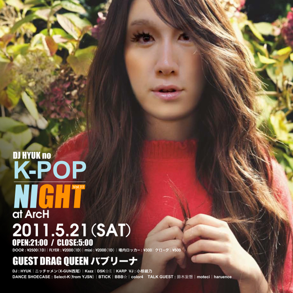4ヶ月振りの開催となるvol.11は、いつにもまして盛りだくさん! いつもの踊れるK-POP DJプレイはもちろんのこと、 TVにも出演中、自らが主催する安室奈美恵ナイトでのダンスショーも大好評な ドラッグ・クィーン バブリーナちゃんが大登場☆ミ フライヤーでは、某現役高校生歌姫に化けていただきました……! さらにはダンスカバーショーも大増強。 トークタイムもあるでよ、って本当にぎっしり詰め込みました。 他の追随を許さぬ、圧倒的ボリュームでお届けします!! ●2011年5月21日 (土曜日) 21:00〜5:00 ●場所 ArcH