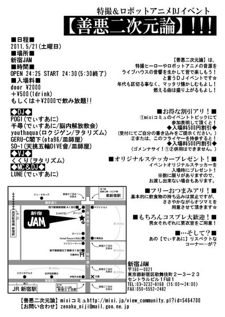 【善悪二次元論】は、特撮ヒーローやロボットアニメの音源をライブハウスの音響を生かして皆で楽しもう!!と言うDJイベントです☆ 年代も区切る事なく、マッタリ懐かしむもよし!燃える曲は盛り上がるもよし! ■日程■ 2011.5/21(土曜日) ■場所■ 新宿JAM http://jam.rinky.info/map.html ■時間■ OPEN 24:25 START 24:30(5:30終了) ■入場料■ door 2000 +500(1drink) もしくは +2000で飲み放題 ◆DJ◆ POGI(でぃすあに) 千尋(でぃすあに/脳内解放教会) youthaqua(ロクジゲン/ヲタリズム) GERU-C閣下(ota96/皿師屋)