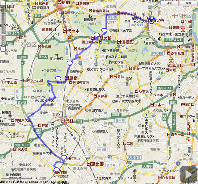 ママチャリも小径車もカモン!な 深夜の都心をゆるゆるペースで楽しむイベントです。 今のところ大体月一開催。 概要: 四谷〜中目黒までゆっくり走ります。 今回はあまりネタっぽい事を仕込んでいませんが、 全体的に楽めな道+都心の細道(?)を少々エッセンスに足してます。 終了後に寄るカフェ(希望者のみ)は新しい所を探しました。 今回はミニマムチャージはなさそうですw 時間とルート: 23:00にJR四ッ谷駅麹町口の辺り(1枚目)に集合。 新宿通り-外苑西通り-千駄ヶ谷-原宿-代々木公園(トイレ休憩) -松濤-山手/旧山手通り-代官