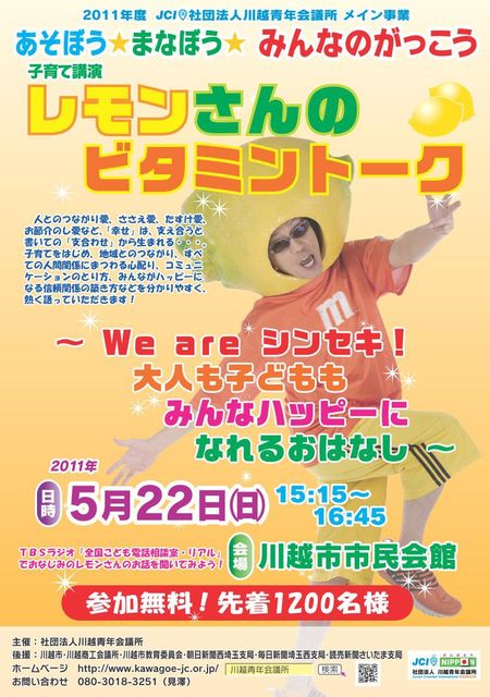 参加無料!先着1200名様!!15:15〜16:45 〜We are シンセキ!大人も子どももみんなハッピーになれるおはなし〜 TBSラジオ「全国こども電話相談室・リアル」でおなじみのレモンさんがやってくる!!満足度は120%保障します!ぜひレモンさんに会いに来て♪