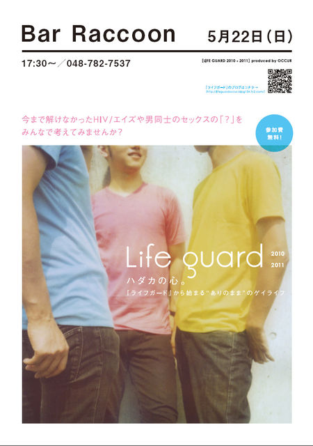 3月20日(日)に開催する予定でした 「LIFE GUARD」 この度の震災の為、延期になっていましたが 5月22日(日)に決定しました。 ゲイライフやエイズのことを楽しく、かつ、 ちょっとまじめに考えるイベントです! 「LIFE GUARD」へ参加したい方は 是非ご連絡くださいませ! ●日時:2011年5月22日(日)17:30〜 ●参加資格:ゲイ、バイセクシュアル男性 ●参加費:無料 ●定員:30名 イベントの後はそのまま飲んで行って下さいませ〜