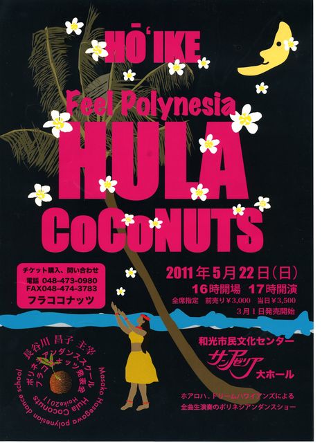 管理人さま 書き込み失礼いたします。 もし不適切でしたら消去願います。 この度 長谷川 昌子主宰「Hulacoconuts」15回目のHoikeが 埼玉県和光市民文化センター サンアアゼリア 大ホールで開催されます。 お近くの方、ご興味のある方がいらっしゃいましたらと思い、紹介させていただきます。 以下詳細です。 ホアロハ、ドリームハワイアンズによる 全曲生演奏のポリネシアンダンスショーです。 2011年5月22日(日) 16時開場 17時開演 全席指定席 3/1発売開始 前売り ¥3000 当日