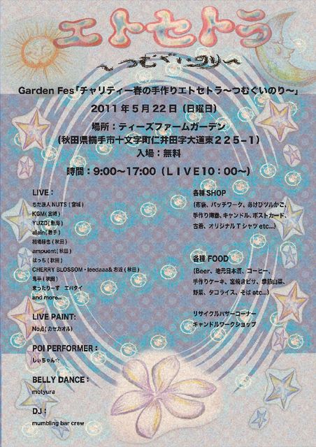 Garden Fes「チャリティー春の手作りエトセトラ〜つむぐいのり〜」 ●2011年5月22日(日曜日) ●場所:ティーズファームガーデン(秋田県横手市十文字町仁井田字大道東225−1) ●入場:無料 ※被災地で活動するアーティストさんたちに義援金を手渡しします。ぜひ、カンパご協力おねがいします。詳細はここに書くより実際、活動のおはなしを聞いた方がいいと思うので、あえては書きません。ご了承ください。 ●時間:9:00〜18:00 ●各種SHOP(布袋、パッチワーク、あけびツルかご、手作り陶器、キャンドル、ポストカード、古着