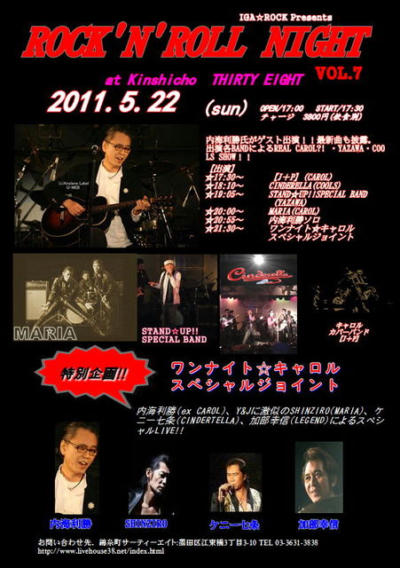 告知失礼致します。 IGA☆ROCK Presents 『ROCK'N'ROLL NIGHT VOL.7』 錦糸町サーティーエイト open/17:00 start/17:30 チャージ 3800円(飲食代別) 内海利勝氏がゲスト出演最新曲も披露。 出演各BANDによるリアルキャロル!? YAZAWA COOLS SHOW!!! 【出演】 ★17:30〜 J+P(CAROL) ★18:10〜 CINDERELLA(COOLS) ★19:05〜 STAND☆UP!!SPECIAL BAND(YAZAWA) ★20:00〜 MARIA(CAROL) ★20:55〜 内海利勝ソロ ★21:30〜 ワンナイト☆キャロルスペシャルジョイント IGA☆ROCKも今回で二周年を迎えさせてい