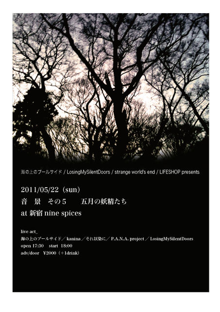 海の上のプールサイド / LosingMySilentDoors / strange world's end / LIFESHOP presents 音景その5 『5月の妖精たち』 海の上のプールサイド 1st EP「シネマ」 ディスクユニオン販売開始記念! http://mixi.jp/view_event.pl?id=61120274&comm_id=4925221 日時 2011年05月22日(日) 開場17:30/開演18:00 場所 新宿Nine Spices HP : http://9spices.rinky.info/ 料金 前売/当日ともに2,000円(ドリンク代別) ※飲み放題コースなし ● 会場へのアクセス 【新宿駅東口から明治通りルート】 JR新宿駅東口を出