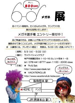 こんにちはー! 夏の日差しが眩しくなってくるこれからの季節! そこで、ヴァケイションクラブでは、 ウルトラポップアイテムWEB STORE Pe & Sak の協力を頂き、 粋なイベントを開催することになりました! レディース アーンド ジェントルメン! 「 メ ガ ネ 展 」 とびっきりのサングラス!だてメガネ!がてんこ盛り! その中からあなたらしい1つを選んでください! イベント期間中、どのメガーネも 800yen !!!!!!! ※ メガネ選手権エントリー 受付中! メガネ展でお買い上げ頂いたメガネをお召しになり