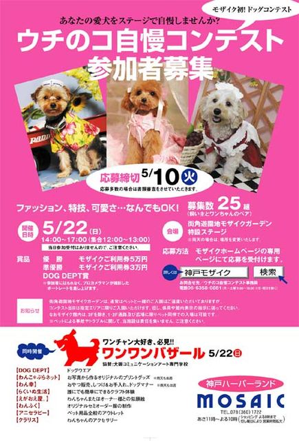 5月22日に開催される、神戸モザイク初のドッグイベントで 「うちのコ自慢コンテスト」が開催されます。 応募参加者にもれなく、プロカメラマンの撮影によるポートレート(木製フレーム付き)がプレゼントされ、 入賞者にはナント5万円の商品券がもらえるという、豪華なコンテストです まだ予定頭数に達していないので、ご興味のある方は是非! 応募しないと損するかも〜 応募の詳細は下記で http://mosaic-event.jimdo.com/ コンテストに参加しなくても、似顔絵コーナーや おやつバイキング、